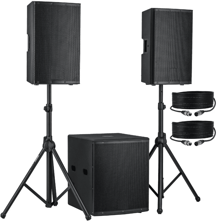 1 caisson de basses amplifié avec 2 enceintes satellites, câblage.